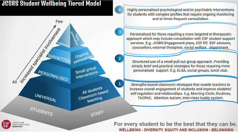 我們視身心健康為多維度的概念,並採用分層健康模式,支持沒有放諸四海皆準的方法這一研究。我們模式的廣度涵蓋從全校性方針到高度個人化的治療計劃,當中結合多專業機構。通過培養緊密關係,我們營造一個讓每個人都感到被重視的連結文化。